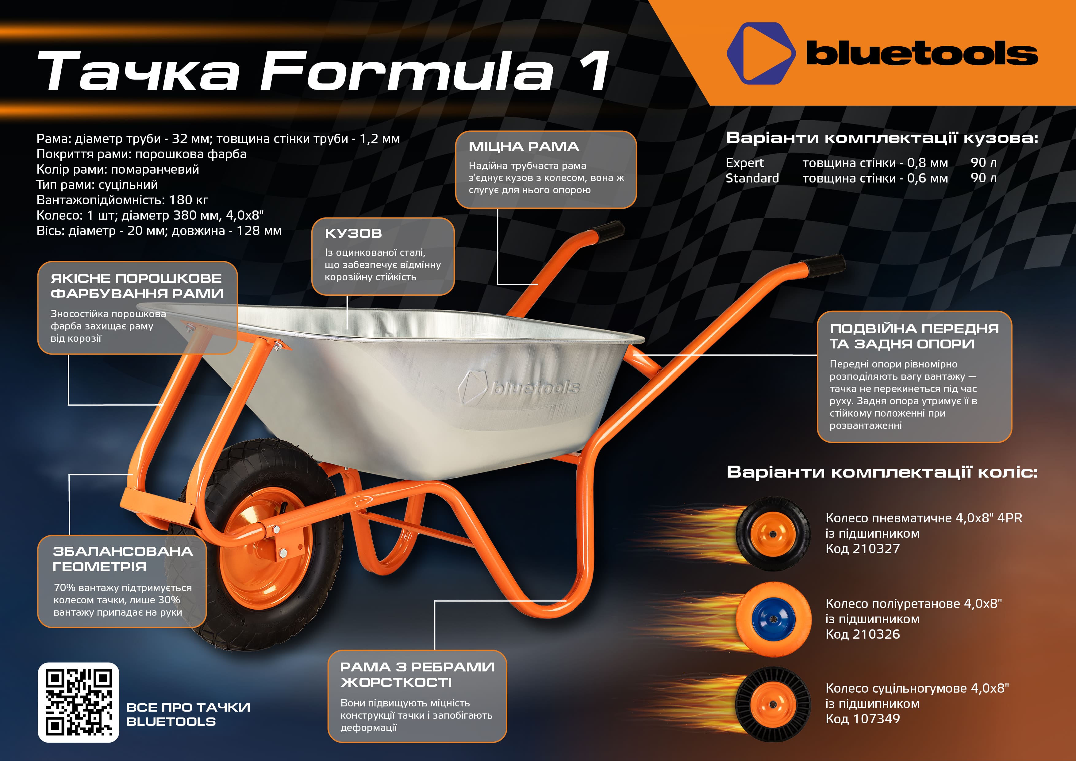 Тачка будівельна BLUETOOLS Formula 1 Standard (90 л, 180 кг, ПУ) (220-4012)